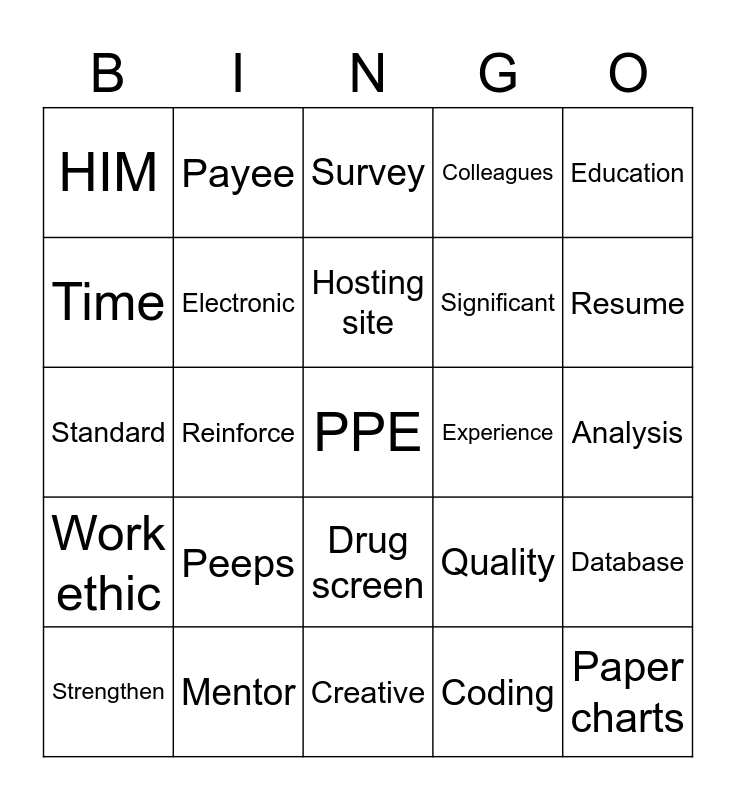 This bingo card has a free space and 68 words: HIPAA, Paper charts, Compliance, Confidentiality, Hospital, Patient, Payee, Consultant, Hosting site, Affiliation, Drug screen, Job, Analysis, Education, Learning, Time, Reinforce, HIM, Vaccinations, Peeps, Significant, Quality, Work ethic, Applied, Theory, Professional, Services, Technical, Database, Access, Survey, System, Supervised activity, Study, Colleagues, Peers, Student, Strengthen, Resume, Standard, Health record, Software, Electronic, Schedule, Background check, Evaluated, Medical, CEU, Experience, Mentor, COVID, Hybrid, Policy, Creative, Information, Positive, Coding, Graduation, Opportunities, Collaborate, Health information, Orientation, Designed, Profession, Instruction, Program Director, Insurance and Different.