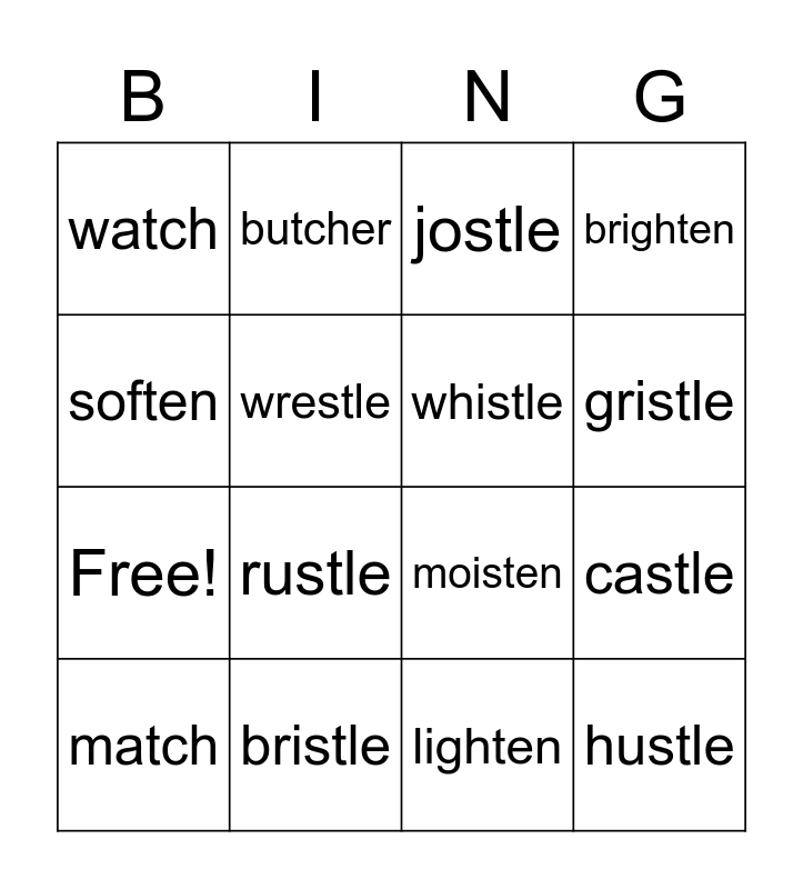 This bingo card has 20 words: castle, fasten, jostle, listen, match, soften, bristle, watch, Free!, butcher, rustle, moisten, wrestle, hustle, whistle, glisten, gristle, brighten, lighten and nestle.
