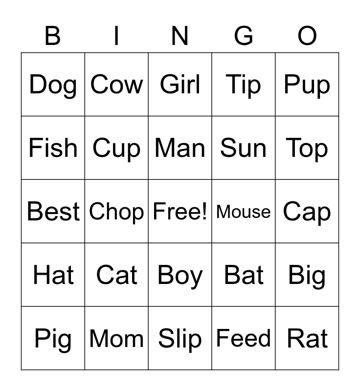 This bingo card has a free space and 24 words: Cat, Mom, Man, Pig, Pup, Dog, Fish, Cow, Mouse, Boy, Sun, Best, Bat, Big, Cup, Feed, Cap, Girl, Top, Chop, Rat, Hat, Tip and Slip.