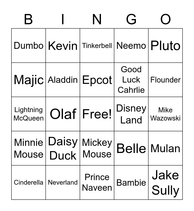 This bingo card has a free space and 29 words: Cinderella, Shrek, Olaf, Dory, Dumbo, Tinkerbell, Aladdin, Daisy Duck, Disney Land, Neverland, Mike Wazowski, Jake Sully, Prince Naveen, Bambie, Flounder, Bambi, Mickey Mouse, Minnie Mouse, Pluto, Lightning McQueen, Belle, Maui, Good Luck Cahrlie, Majic, Neemo, Kevin, Mulan, Epcot and Simba.