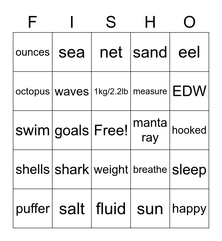 This bingo card has a free space and 24 words: shark, salt, 1kg/2.2lb, puffer, eel, ounces, octopus, sea, manta ray, weight, measure, swim, breathe, sleep, waves, sun, hooked, net, EDW, goals, happy, shells, sand and fluid.