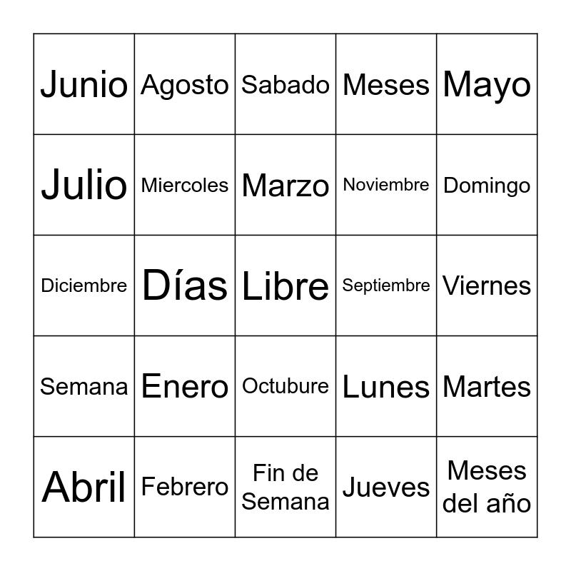 This bingo card has a free space and 24 words: Enero, Febrero, Marzo, Abril, Mayo, Junio, Julio, Agosto, Septiembre, Octubure, Noviembre, Diciembre, Lunes, Martes, Miercoles, Jueves, Viernes, Sabado, Domingo, Días, Meses del año, Semana, Meses and Fin de Semana.