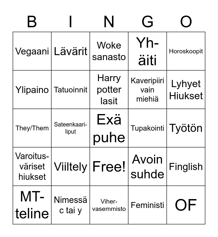 This bingo card has 26 words: Free!, Feministi, Harry potter lasit, Nimessä c tai y, Horoskoopit, Vegaani, Ylipaino, Lävärit, Työtön, Avoin suhde, Kaveripiiri vain miehiä, They/Them, Finglish, MT-teline, Sateenkaari- liput, Gootti, Yh- äiti, Varoitus- väriset hiukset, Woke sanasto, Exä puhe, Lyhyet Hiukset, Viher- vasemmisto, Tupakointi, Viiltely, Tatuoinnit and OF.