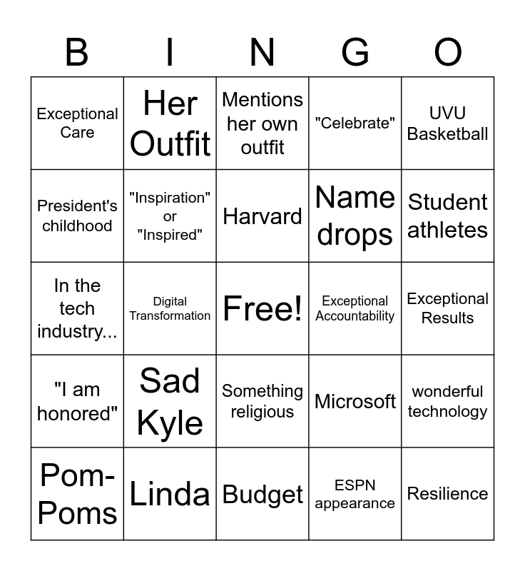 This bingo card has a free space and 24 words: Sad Kyle, Linda, Harvard, Pom-Poms, UVU Basketball, Exceptional Care, President's childhood, Her Outfit, Exceptional Accountability, Something religious, Name drops, In the tech industry..., Microsoft, wonderful technology, "Inspiration" or "Inspired", ESPN appearance, Exceptional Results, Mentions her own outfit, Student athletes, Digital Transformation, Resilience, "I am honored", "Celebrate" and Budget.