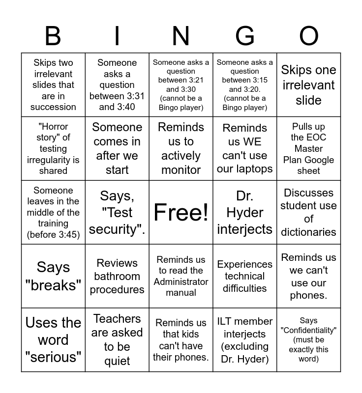 This bingo card has a free space and 24 words: Reviews bathroom procedures, Teachers are asked to be quiet, Reminds us to actively monitor, Uses the word "serious", Skips one irrelevant slide, Skips two irrelevant slides that are in succession, "Horror story" of testing irregularity is shared, Someone asks a question between 3:31 and 3:40, Dr. Hyder interjects, Reminds us to read the Administrator manual, Reminds us WE can't use our laptops, Someone leaves in the middle of the training (before 3:45), Experiences technical difficulties, Reminds us we can't use our phones., Someone comes in after we start, ILT member interjects (excluding Dr. Hyder), Discusses student use of dictionaries, Someone asks a question between 3:21 and 3:30 (cannot be a Bingo player), Pulls up the EOC Master Plan Google sheet, Says, "Test security"., Says "Confidentiality" (must be exactly this word), Says "breaks", Someone asks a question between 3:15 and 3:20. (cannot be a Bingo player) and Reminds us that kids can't have their phones..