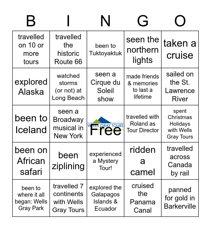 This bingo card has a free space and 24 words: been ziplining, travelled 7 continents with Wells Gray Tours, seen a Cirque du Soleil show, been to where it all began: Wells Gray Park, taken a cruise, travelled on 10 or more tours, explored Alaska, travelled the historic Route 66, travelled with Roland as Tour Director, experienced a Mystery Tour!, made friends & memories to last a lifetime, been to Iceland, ridden a camel, travelled across Canada by rail, watched storms (or not) at Long Beach, cruised the Panama Canal, spent Christmas Holidays with Wells Gray Tours, been to Tuktoyaktuk, sailed on the St. Lawrence River, seen a Broadway musical in New York, panned for gold in Barkerville, been on African safari, seen the northern lights and explored the Galapagos Islands & Ecuador.