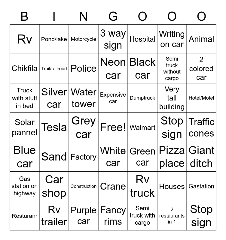 This bingo card has a free space and 48 words: Blue car, Tesla, Purple car, White car, Black car, Stop sign, Animal, Resturanr, Silver car, Grey car, 3 way sign, Hospital, Very tall building, Hotel/Motel, Solar pannel, Car shop, Motorcycle, Expensive car, Rv truck, Writing on car, 2 colored car, Chikfila, Pond/lake, Police, Semi truck with cargo, Semi truck without cargo, Traffic cones, Gas station on highway, Sand, Water tower, Crane, Dumptruck, Houses, Gastation, Rv, Rv trailer, Factory, Fancy rims, Walmart, 2 restaurants in 1, Giant ditch, Truck with stuff in bed, Trail/railroad, Construction, Neon car, Green car, Pizza place and Stop sign.