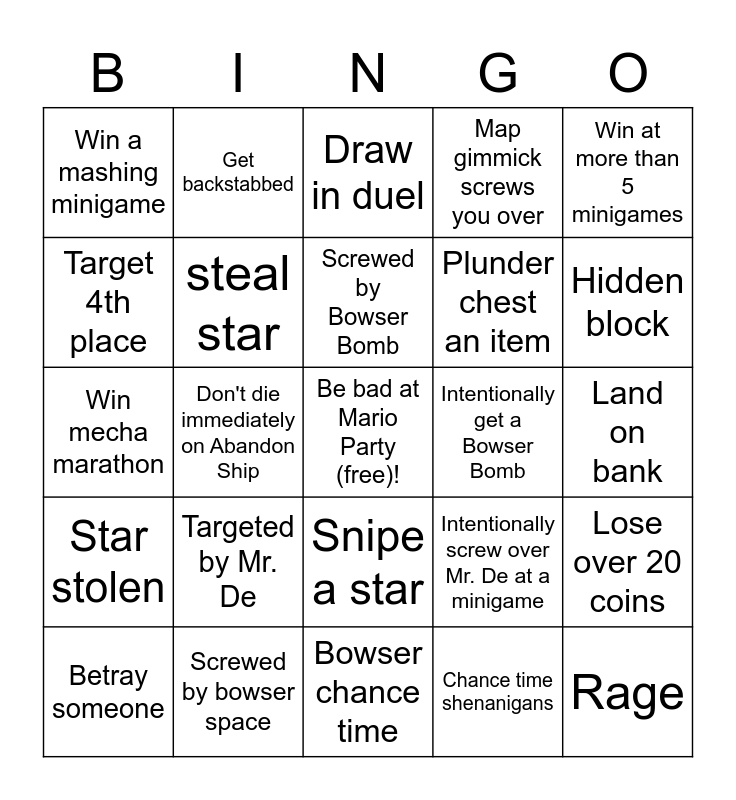 This bingo card has a free space and 24 words: Targeted by Mr. De, Screwed by bowser space, Screwed by Bowser Bomb, Betray someone, Win at more than 5 minigames, Win a mashing minigame, Target 4th place, Get backstabbed, Intentionally get a Bowser Bomb, Snipe a star, Plunder chest an item, Win mecha marathon, Intentionally screw over Mr. De at a minigame, Lose over 20 coins, steal star, Chance time shenanigans, Land on bank, Draw in duel, Hidden block, Don't die immediately on Abandon Ship, Rage, Star stolen, Map gimmick screws you over and Bowser chance time.