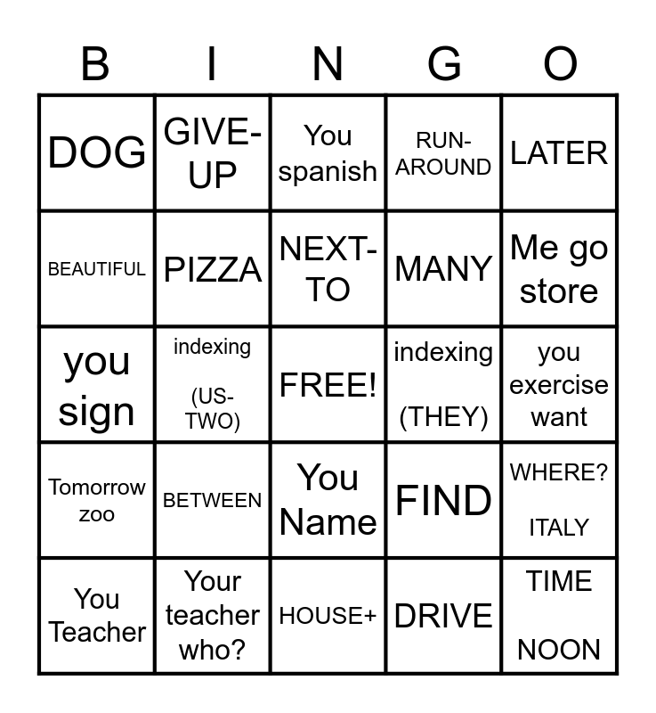 This bingo card has a free space and 49 words: WHERE? LIBRARY, TIME NOON, EAT-MORNING, HOUSE+, BETWEEN, COW, GIVE-UP, PICTURE, BEAUTIFUL, WATER, PIZZA, RUN-AROUND, WHERE? ITALY, FIND, SLOW, PAH, NEXT-TO, indexing (THEY), NINE, LATER, indexing (US-TWO), DRIVE, DOG, MANY, Where you, Me go store, You Teacher, Watch football game, You Name, Tomorrow zoo, Yesterday Me run, Finish Jump, Me student Gallaudet, Tomorrow Sue buy house, Your teacher who?, School you go where, Your teacher name, Sibling have you, you exercise want, Cat black trees climb, your, Me yesterday, stay home yesterday., Fish me don’t like, Her money lost, she upset., You deaf, you sign, You spanish, Four boys from chat deaf school, seem will rain and Tonight me see movie.