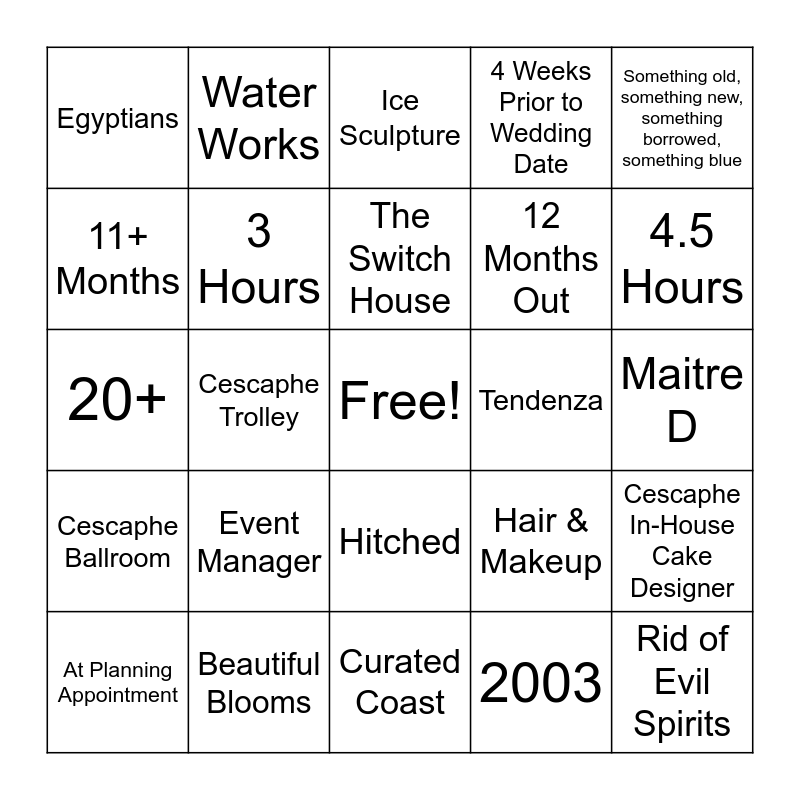 This bingo card has a free space and 61 words: 8, Beautiful Blooms, The Owner’s Daughters, Cescaphe Ballroom, 2003, Cescaphe University, 3 Hours, 90 Days Prior, 12 Months Out, 10 Months Out, 4 Weeks Prior to Wedding Date, 8 Weeks, 11+ Months, Day Of, Queen Victoria, Egyptians, Rid of Evil Spirits, Something old, something new, something borrowed, something blue, 4, The Switch House, Tendenza, Ice Sculpture, At Planning Appointment, Cescaphe In-House Cake Designer, Vanilla, Honeymoon, 1 Hour & A Half, 30 Minutes, 4.5 Hours, Glass, Bouquet, Paper, Top Tier of Wedding Cake, First Look, Water Works, I Do, Champagne, Cescaphe Trolley, 15-30, 20+, Event Manager, Event Manager, Maitre D, At Planning Appointment, Hair & Makeup, Trend, Owner’s Mom, Cold Sparklers, Left, Hitched, Curated Coast, Hotel Welcome Boxes, Bird Cage, Chickies & Petes, 90 Minutes Prior, Red Oyster USA, Filet Mignon, Lamb Chops, New Pace, Franklin’s View and Petal Cannon.