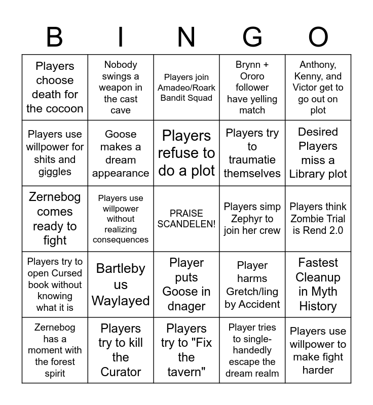 This bingo card has a free space and 24 words: Zernebog has a moment with the forest spirit, Bartleby us Waylayed, Players refuse to do a plot, Player tries to single-handedly escape the dream realm, Anthony, Kenny, and Victor get to go out on plot, Players choose death for the cocoon, Nobody swings a weapon in the cast cave, Players join Amadeo/Roark Bandit Squad, Players simp Zephyr to join her crew, Players think Zombie Trial is Rend 2.0, Zernebog comes ready to fight, Goose makes a dream appearance, Player harms Gretch/ling by Accident, Fastest Cleanup in Myth History, Players use willpower for shits and giggles, Players try to kill the Curator, Players try to "Fix the tavern", Brynn + Ororo follower have yelling match, Desired Players miss a Library plot, Players try to open Cursed book without knowing what it is, Players use willpower without realizing consequences, Player puts Goose in dnager, Players try to traumatie themselves and Players use willpower to make fight harder.
