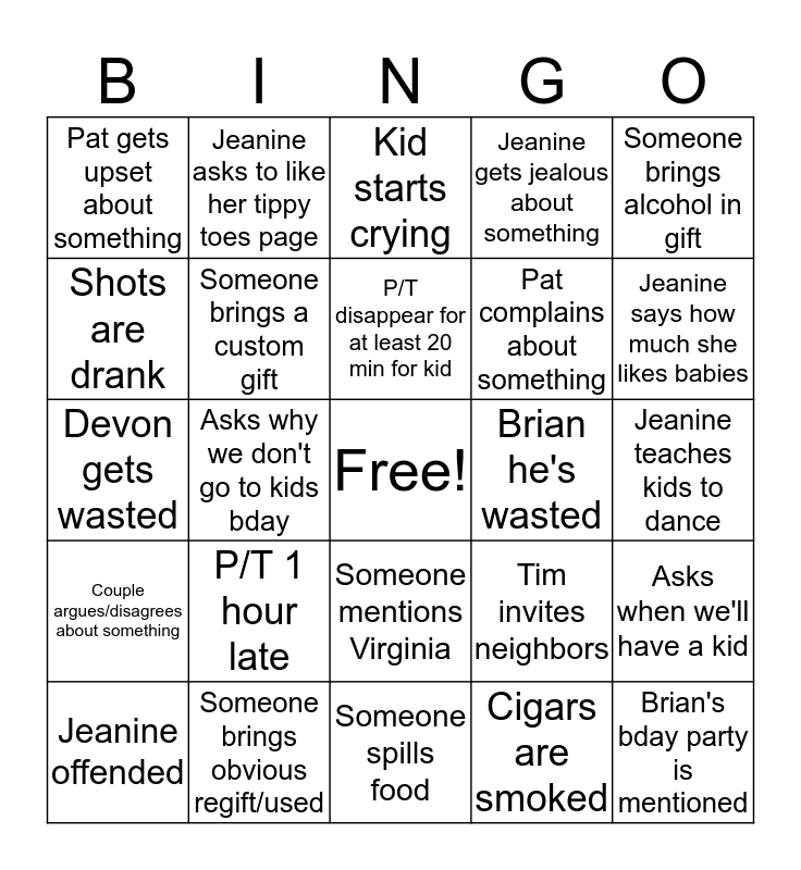 This bingo card has a free space and 24 words: P/T 1 hour late, Someone brings obvious regift/used, P/T disappear for at least 20 min for kid, Jeanine offended, Someone brings alcohol in gift, Pat gets upset about something, Shots are drank, Jeanine asks to like her tippy toes page, Brian he's wasted, Someone mentions Virginia, Pat complains about something, Devon gets wasted, Tim invites neighbors, Asks when we'll have a kid, Someone brings a custom gift, Cigars are smoked, Jeanine teaches kids to dance, Kid starts crying, Jeanine says how much she likes babies, Asks why we don't go to kids bday, Brian's bday party is mentioned, Couple argues/disagrees about something, Jeanine gets jealous about something and Someone spills food.