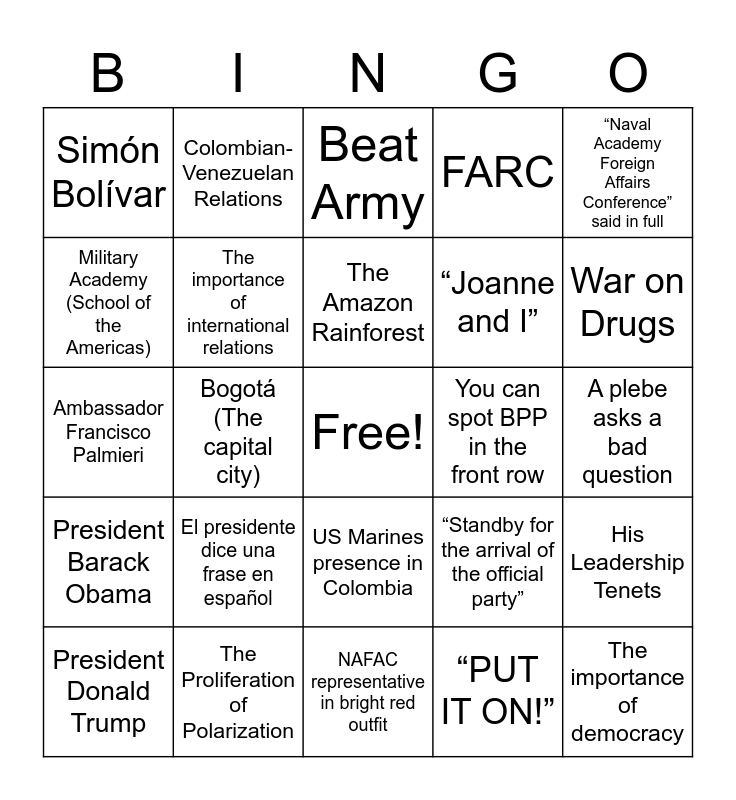This bingo card has a free space and 25 words: El presidente dice una frase en español, NAFAC representative in bright red outfit, The Amazon Rainforest, President Donald Trump, “Naval Academy Foreign Affairs Conference” said in full, Simón Bolívar, Military Academy (School of the Americas), Colombian-Venezuelan Relations, You can spot BPP in the front row, US Marines presence in Colombia, “Joanne and I”, Ambassador Francisco Palmieri, “Standby for the arrival of the official party”, His Leadership Tenets, The importance of international relations, Mike is taller than the speaker, A plebe asks a bad question, Beat Army, War on Drugs, Bogotá (The capital city), The importance of democracy, The Proliferation of Polarization, President Barack Obama, FARC and “PUT IT ON!”.