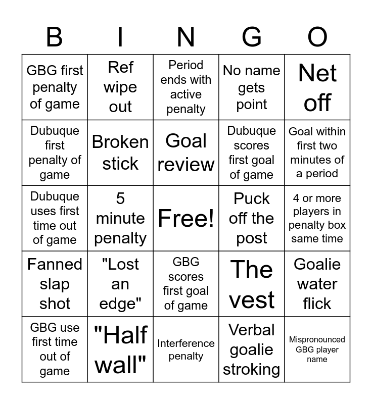 This bingo card has a free space and 24 words: "Lost an edge", "Half wall", Goal review, GBG use first time out of game, Net off, GBG first penalty of game, Dubuque first penalty of game, Ref wipe out, Puck off the post, GBG scores first goal of game, Dubuque scores first goal of game, Dubuque uses first time out of game, The vest, Goalie water flick, Broken stick, Verbal goalie stroking, 4 or more players in penalty box same time, Period ends with active penalty, Goal within first two minutes of a period, 5 minute penalty, Mispronounced GBG player name, Fanned slap shot, No name gets point and Interference penalty.