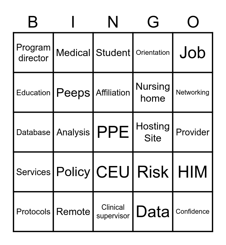 This bingo card has a free space and 54 words: Onboarding, Services, Facility, Health information, CEU, Drug screen, Orientation, Background check, Education, Variety, Program director, Intern, Remote, Protocols, Software, Clinical supervisor, Confidence, Nursing home, Study, Provider, Risk, Coding, Hosting Site, Job, Code of ethics, Medical, Electronic, Patient, Health record, Data, EHR, COVID, Resume, Peers, Student, Colleagues, Database, HIM, Reinforce, Peeps, Paper charts, Graduation, Hybrid, Profession, Policy, Flexibility, HIPAA, Face-to-face, Affiliation, Analysis, Networking, Theory, Technical and Time.