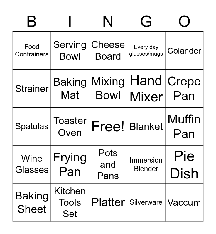 This bingo card has a free space and 24 words: Frying Pan, Kitchen Tools Set, Mixing Bowl, Baking Sheet, Colander, Food Contrainers, Strainer, Serving Bowl, Blanket, Pots and Pans, Hand Mixer, Spatulas, Immersion Blender, Pie Dish, Baking Mat, Silverware, Muffin Pan, Cheese Board, Crepe Pan, Toaster Oven, Vaccum, Wine Glasses, Every day glasses/mugs and Platter.