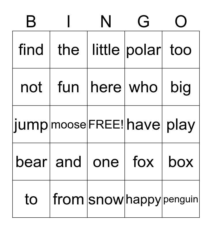 This bingo card has a free space and 24 words: and, from, here, to, too, find, not, the, have, one, who, jump, fox, box, fun, happy, play, little, big, moose, penguin, bear, polar and snow.