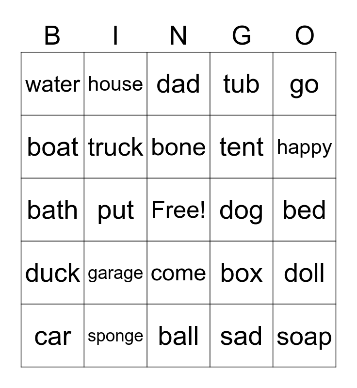 This bingo card has a free space and 24 words: garage, sponge, bone, car, go, water, boat, house, dog, come, tent, bath, box, doll, truck, sad, bed, dad, happy, put, soap, duck, tub and ball.