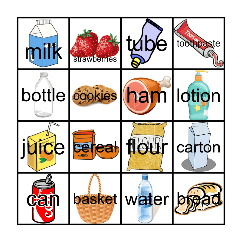 This bingo card has 20 images and 20 words: carton, box, tube, bag, can, bottle, basket, milk, juice, strawberries, cereal, flour, cookies, bread, ham, cheese, lotion, toothpaste, water and yogurt.