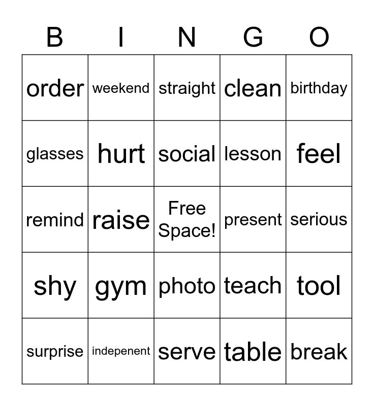 This bingo card has a free space and 24 words: gym, indepenent, social, surprise, birthday, order, glasses, weekend, present, photo, lesson, remind, teach, tool, hurt, table, serious, straight, feel, raise, break, shy, clean and serve.
