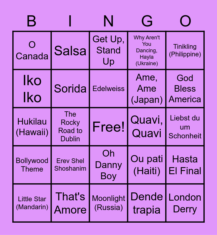 This bingo card has a free space and 24 words: Erev Shel Shoshanim, That's Amore, Edelweiss, Little Star (Mandarin), Tinikling (Philippine), O Canada, Iko Iko, Salsa, Quavi, Quavi, Oh Danny Boy, Ame, Ame (Japan), Hukilau (Hawaii), Ou pati (Haiti), Hasta El Final, Sorida, Dende trapia, Liebst du um Schonheit, Get Up, Stand Up, God Bless America, The Rocky Road to Dublin, London Derry, Bollywood Theme, Why Aren't You Dancing, Hayla (Ukraine) and Moonlight (Russia).