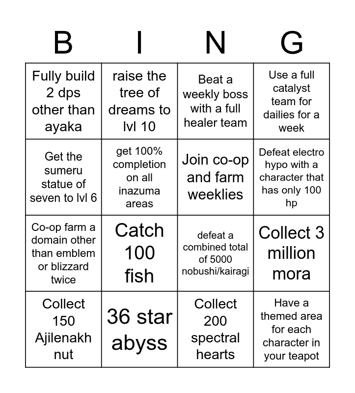 This bingo card has 16 words: 36 star abyss, Collect 3 million mora, Beat a weekly boss with a full healer team, Fully build 2 dps other than ayaka, Co-op farm a domain other than emblem or blizzard twice, raise the tree of dreams to lvl 10, defeat a combined total of 5000 nobushi/kairagi, Collect 200 spectral hearts, Get the sumeru statue of seven to lvl 6, get 100% completion on all inazuma areas, Collect 150 Ajilenakh nut, Use a full catalyst team for dailies for a week, Catch 100 fish, Defeat electro hypo with a character that has only 100 hp, Join co-op and farm weeklies and Have a themed area for each character in your teapot.