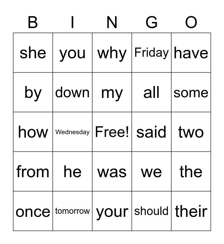 This bingo card has a free space and 29 words: once, today, Wednesday, could, she, why, down, he, said, tomorrow, two, their, your, should, some, because, was, from, have, how, we, picture, all, by, Friday, you, the, my and here.