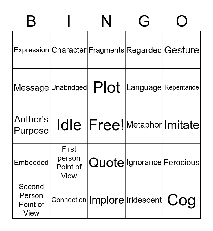 This bingo card has a free space and 24 words: First person Point of View, Connection, Plot, Second Person Point of View, Gesture, Expression, Message, Character, Metaphor, Quote, Language, Author's Purpose, Ignorance, Ferocious, Unabridged, Iridescent, Imitate, Fragments, Repentance, Idle, Cog, Embedded, Regarded and Implore.