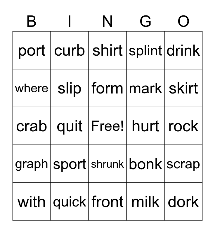 This bingo card has a free space and 35 words: stink, song, park, slip, shrunk, splint, where, wrong, form, song, crab, drink, work, carb, port, hurt, milk, quit, graph, dork, bonk, with, scrap, quick, shirt, skirt, over, her, mark, rock, plant, front, sport, curb and quick.