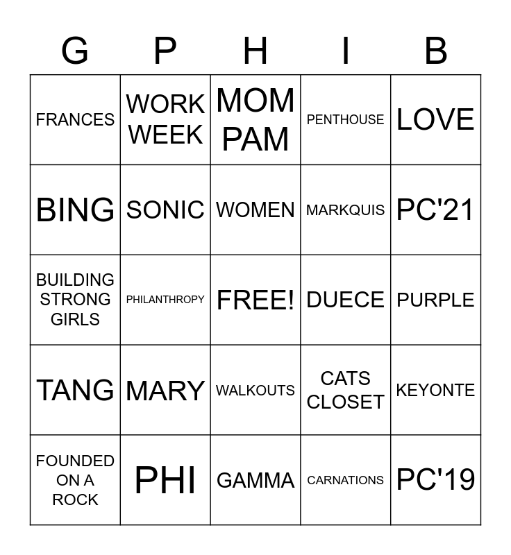 This bingo card has a free space and 74 words: 1807, BETA, MOM PAM, GREENHOUSE, ICEBOX, MODE ROAD, AWESOME ALLEY, SUNDECK, FOUNDED ON A ROCK, TODD QUAD, KSTATE, TUNDRA, WOMEN, BING, PC'22, PHILANTHROPY, SISTERHOOD, PC'21, GIRLS ON THE RUN, BUILDING STRONG GIRLS, SONIC, WORK WEEK, PENTHOUSE, CATS, PC'19, TRUE, TODD, CRESCENT, FORMAL, REC, LOVE, PC'20, LABOR, LOYALTY, LEARNING, CARNATIONS, RECRUITMENT, FIDELITY, PACE, BROWN, GAMMA, PHI, CHAPTER, SISTERS, HELEN, FRANCES, ADELINE, MARY, BIG, LITTLE, PINK, CONSTANT, PURPLE, 1874, PURGATORY, SAUNA, WALKOUTS, COFFEE, DERB, KEYONTE, MARKQUIS, TOMLIN, TANG, KLIEMAN, DUECE, PRESIDENT PAIGE, FORD, EMAW, CATS CLOSET, MOON, STRONG GIRL SUNDAY, PANLOVE, BUNDT CAKES and MOONBALL.