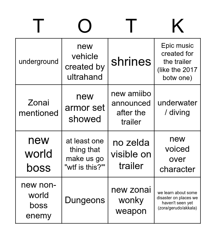 This bingo card has 16 words: Dungeons, new voiced over character, shrines, underground, new world boss, new vehicle created by ultrahand, no zelda visible on trailer, new zonai wonky weapon, Zonai mentioned, new armor set showed, new non-world boss enemy, Epic music created for the trailer (like the 2017 botw one), at least one thing that make us go "wtf is this?"', underwater / diving, new amiibo announced after the trailer and we learn about some disaster on places we haven't seen yet (zora/gerudo/akkala).