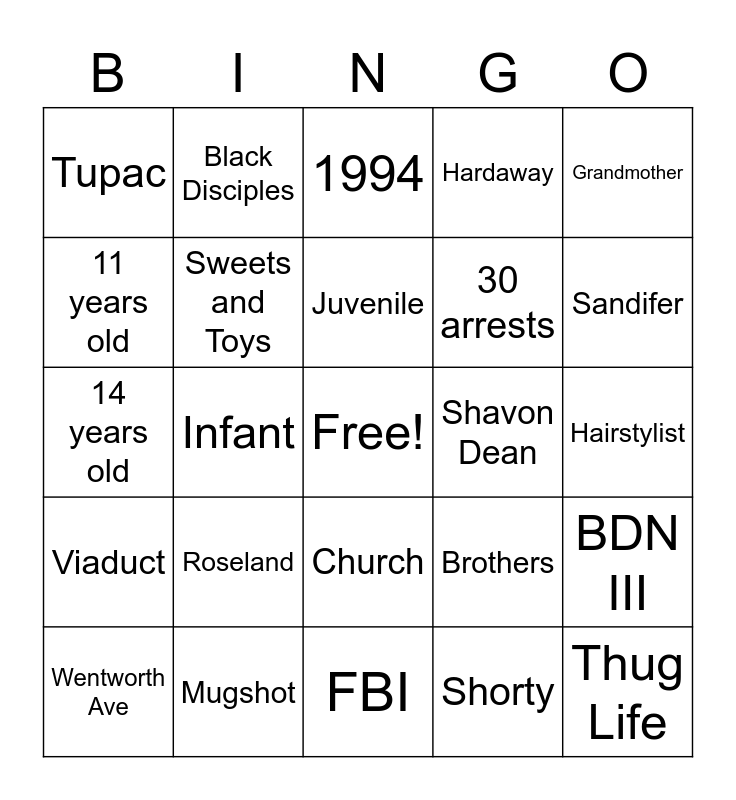This bingo card has a free space and 24 words: Roseland, Mugshot, Juvenile, Wentworth Ave, Grandmother, Tupac, 11 years old, Black Disciples, Shavon Dean, Church, 30 arrests, 14 years old, Brothers, BDN III, Sweets and Toys, Shorty, Hairstylist, 1994, Sandifer, Infant, Thug Life, Viaduct, Hardaway and FBI.