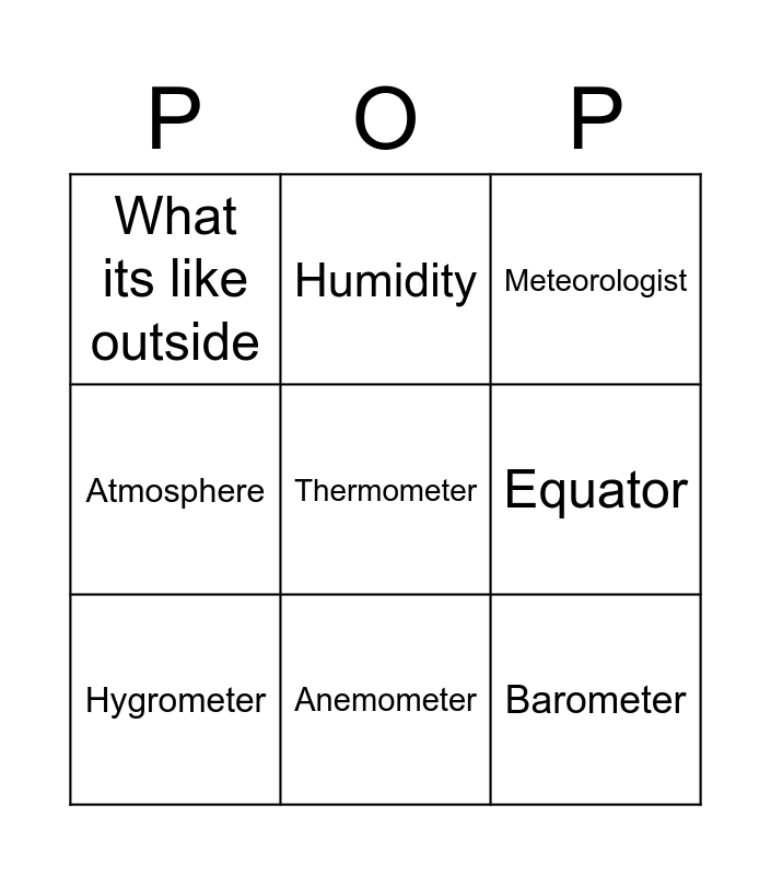 This bingo card has a free space and 8 words: Equator, Meteorologist, Humidity, Hygrometer, What its like outside, Barometer, Atmosphere and Anemometer.