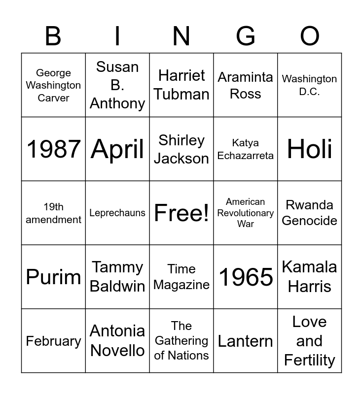 This bingo card has a free space and 24 words: Tammy Baldwin, Antonia Novello, Shirley Jackson, February, Washington D.C., George Washington Carver, 1987, Susan B. Anthony, American Revolutionary War, Time Magazine, Katya Echazarreta, 19th amendment, 1965, Kamala Harris, April, Lantern, Rwanda Genocide, Harriet Tubman, Holi, Leprechauns, Love and Fertility, Purim, Araminta Ross and The Gathering of Nations.