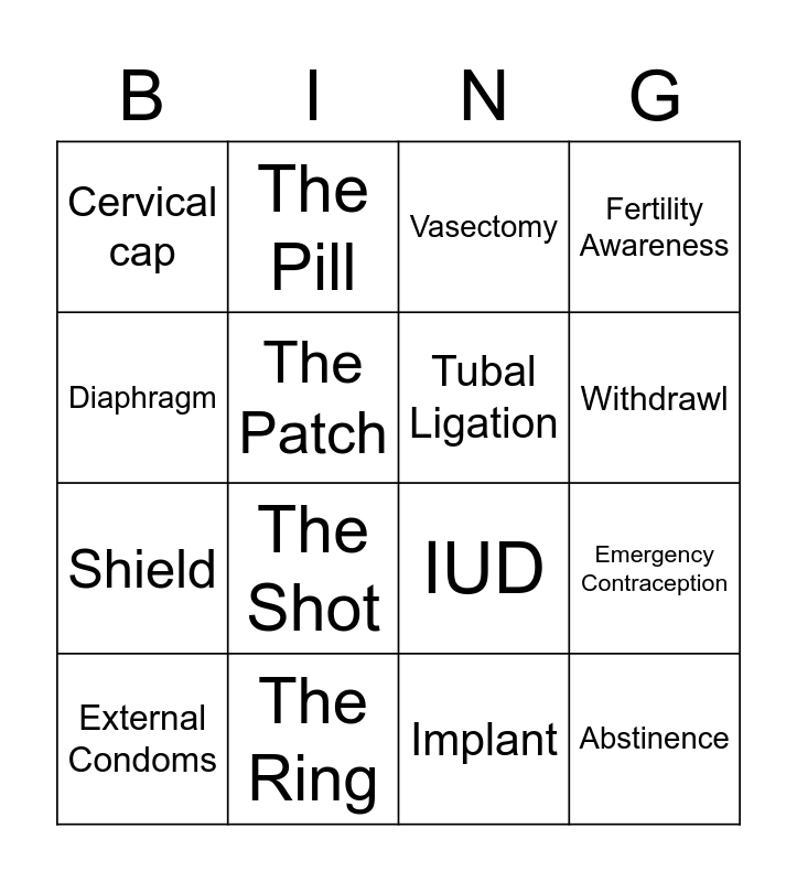 This bingo card has 16 words: External Condoms, The Ring, Vasectomy, Fertility Awareness, Diaphragm, The Pill, IUD, Emergency Contraception, Cervical cap, The Patch, Implant, Withdrawl, Shield, The Shot, Tubal Ligation and Abstinence.