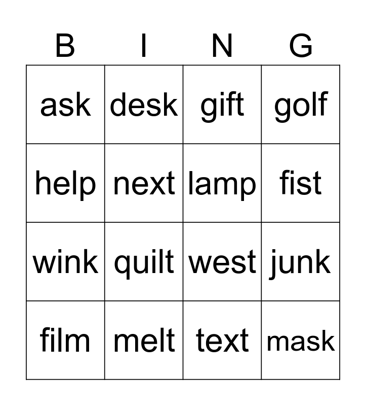 This bingo card has 27 words: hand, sing, wink, lunch, next, gift, desk, mask, melt, test, west, golf, bulb, milk, quilt, jump, lamp, fist, nest, ask, text, best, junk, film, camp, help and silk.