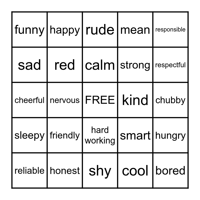 This bingo card has a free space and 24 words: friendly, honest, calm, reliable, responsible, funny, sad, happy, kind, hard working, strong, cheerful, smart, hungry, red, cool, chubby, rude, respectful, nervous, bored, sleepy, mean and shy.