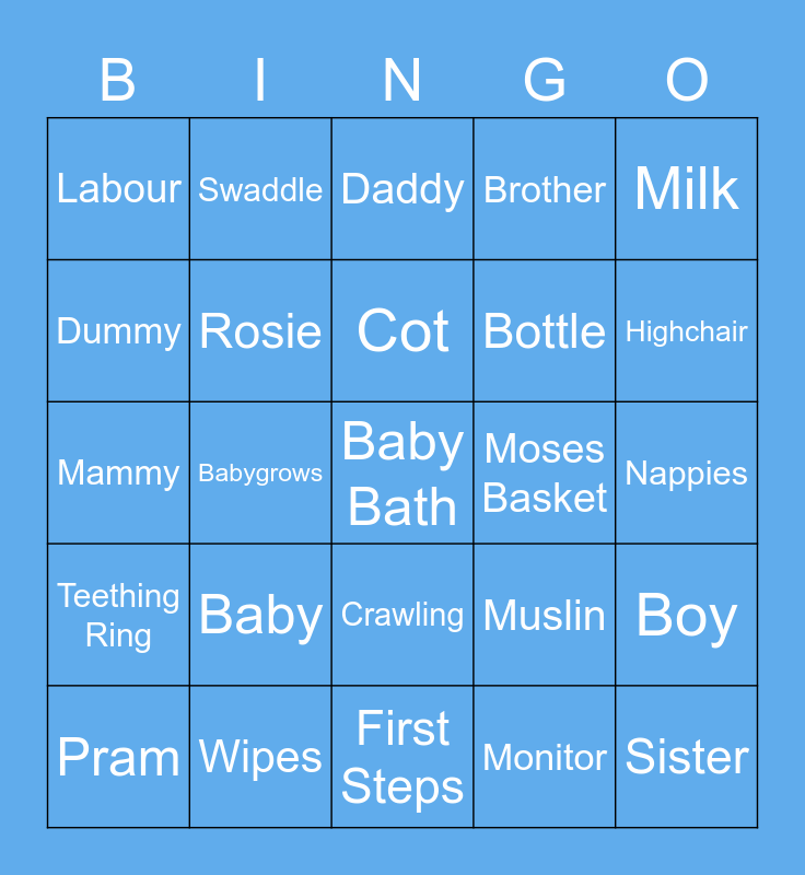 This bingo card has a free space and 24 words: Baby, Wipes, Cot, Pram, Milk, Labour, Dummy, Swaddle, Moses Basket, Crawling, Bottle, Mammy, Muslin, Boy, Rosie, Monitor, Nappies, Daddy, Highchair, Babygrows, Sister, Teething Ring, Brother and First Steps.