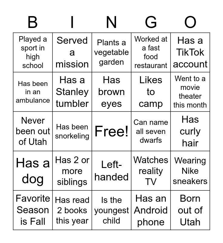 This bingo card has a free space and 24 words: Has 2 or more siblings, Has read 2 books this year, Has brown eyes, Favorite Season is Fall, Has a TikTok account, Played a sport in high school, Has been in an ambulance, Served a mission, Can name all seven dwarfs, Left-handed, Likes to camp, Never been out of Utah, Watches reality TV, Wearing Nike sneakers, Has a Stanley tumbler, Has an Android phone, Has curly hair, Plants a vegetable garden, Went to a movie theater this month, Has been snorkeling, Born out of Utah, Has a dog, Worked at a fast food restaurant and Is the youngest child.