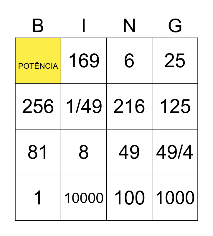 This bingo card has 33 words: 121, 484, 900, 16, 81, 169, 49, 625, POTÊNCIA, 1600, 100, 25, 1/121, 25/4, 16, 49/4, 9/49, 1/49, 9, 4, 1, 27, 6, 1000, 0, 8, 216, 125, 256, 10000, 16/81, 1/125 and 343.