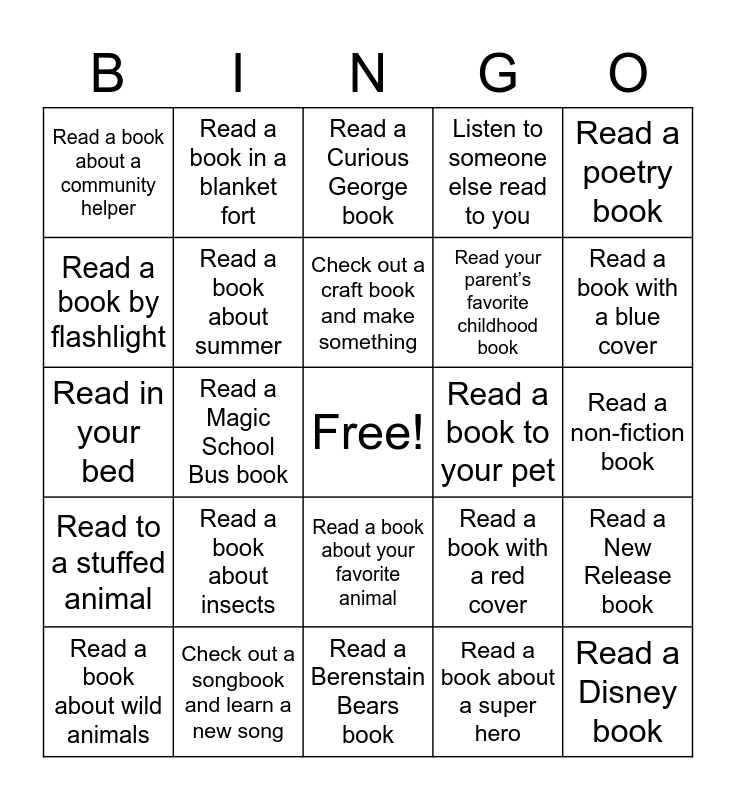 This bingo card has a free space and 24 words: Read a book about insects, Check out a songbook and learn a new song, Check out a craft book and make something, Read a book about wild animals, Read a poetry book, Read a book about a community helper, Read a book by flashlight, Read a book in a blanket fort, Read a book to your pet, Read a book about your favorite animal, Read your parent’s favorite childhood book, Read in your bed, Read a book with a red cover, Read a New Release book, Read a book about summer, Read a book about a super hero, Read a non-fiction book, Read a Curious George book, Read a book with a blue cover, Read a Magic School Bus book, Read a Disney book, Read to a stuffed animal, Listen to someone else read to you and Read a Berenstain Bears book.