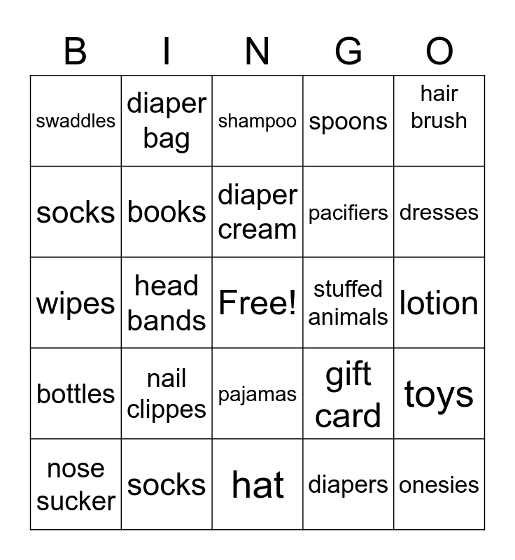 This bingo card has a free space and 24 words: nail clippes, socks, diaper cream, nose sucker, hair brush, swaddles, socks, diaper bag, stuffed animals, pajamas, pacifiers, wipes, gift card, toys, books, diapers, lotion, shampoo, dresses, head bands, onesies, bottles, spoons and hat.