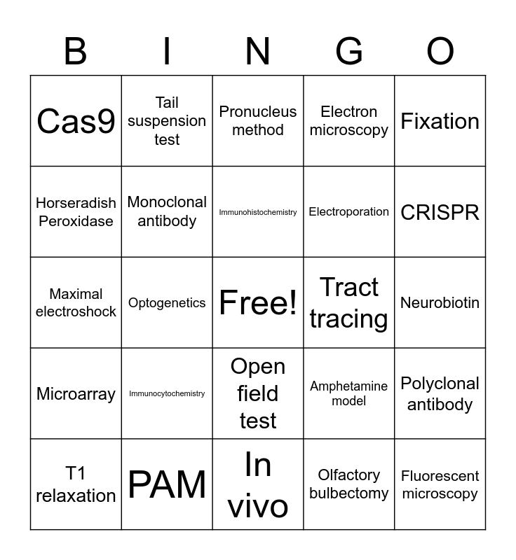 This bingo card has a free space and 38 words: TMS, EEG, MEG, Monoclonal antibody, Polyclonal antibody, Immunocytochemistry, Immunohistochemistry, Perfusion, Fixation, Electroporation, Optogenetics, Electron microscopy, Fluorescent microscopy, Neurobiotin, Horseradish Peroxidase, Microarray, In situ hybridisation, Pronucleus method, ESC method, Tract tracing, Cas9, PAM, CRISPR, T1 relaxation, T2 relaxation, In vivo, In vitro, Electrocoagulation, Intraluminal filament, Tapered beam test, Cuprizone, Open field test, Olfactory bulbectomy, Tail suspension test, Prepulse inhibition test, Amphetamine model, Maximal electroshock and qPCR.