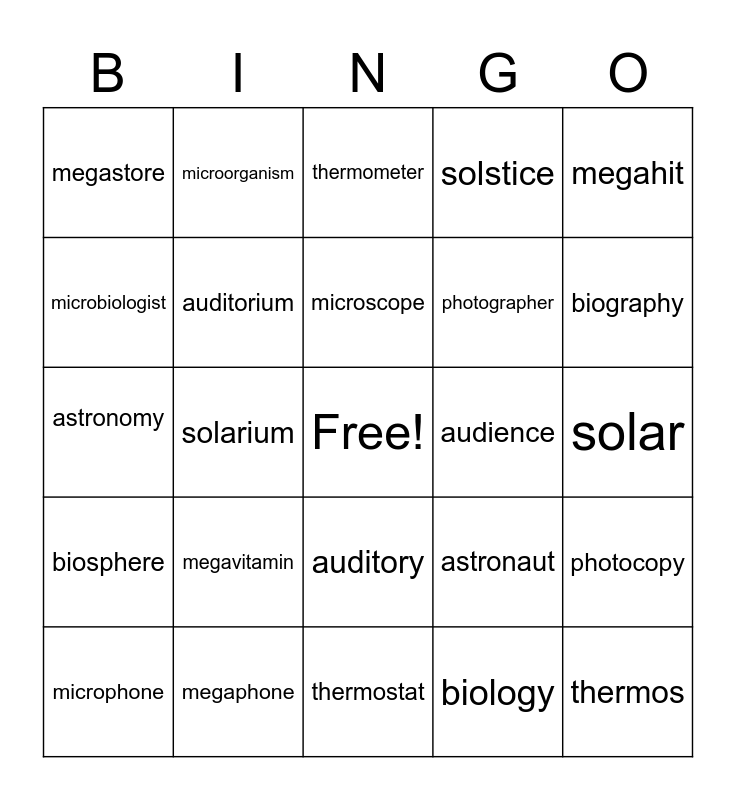 This bingo card has a free space and 24 words: megavitamin, megaphone, microscope, microphone, megahit, megastore, microbiologist, microorganism, audience, auditory, photographer, astronomy, astronaut, photocopy, auditorium, biology, solar, thermometer, biography, solarium, thermos, biosphere, solstice and thermostat.