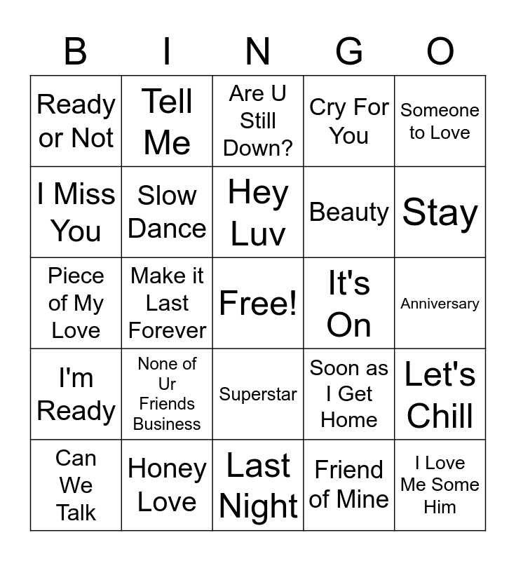 This bingo card has a free space and 28 words: Let's Chill, As We Lay, Beauty, Friend of Mine, I Miss You, Are U Still Down?, Tell Me, I'm Ready, It's On, Can We Talk, Piece of My Love, Cry For You, Honey Love, Last Night, Stay, Hey Lover, None of Ur Friends Business, Slow Dance, Hey Luv, Superstar, Ready or Not, Sweet Thing, I Love Me Some Him, Make it Last Forever, Anniversary, Soon as I Get Home, Someone to Love and Just Kickin.