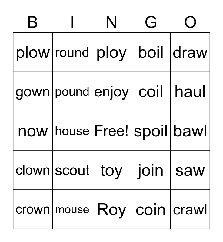 This bingo card has a free space and 42 words: cow, house, boy, soil, crawl, now, mouse, soy, boil, bawl, gown, scout, join, haul, crown, mouth, joy, spoil, haunt, plow, pound, toy, foil, draw, chow, loud, ploy, point, paw, clown, shout, enjoy, coil, saw, brown, cloud, Roy, coin, launch, out, round and dawn.