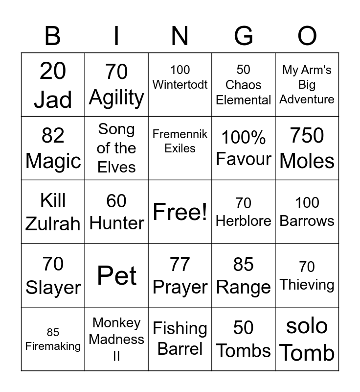 This bingo card has a free space and 24 words: Pet, Monkey Madness II, Fremennik Exiles, 85 Firemaking, My Arm's Big Adventure, 20 Jad, 82 Magic, 70 Agility, 70 Herblore, 77 Prayer, 100% Favour, Kill Zulrah, 85 Range, 70 Thieving, Song of the Elves, 50 Tombs, 100 Barrows, 100 Wintertodt, 750 Moles, 60 Hunter, solo Tomb, 70 Slayer, 50 Chaos Elemental and Fishing Barrel.