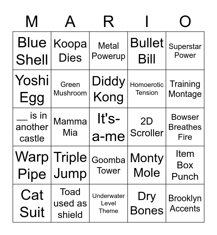 This bingo card has a free space and 24 words: Triple Jump, Toad used as shield, Diddy Kong, Cat Suit, Superstar Power, Blue Shell, Yoshi Egg, Koopa Dies, 2D Scroller, Goomba Tower, Homoerotic Tension, __ is in another castle, Monty Mole, Item Box Punch, Green Mushroom, Dry Bones, Bowser Breathes Fire, Metal Powerup, Training Montage, Mamma Mia, Brooklyn Accents, Warp Pipe, Bullet Bill and Underwater Level Theme.