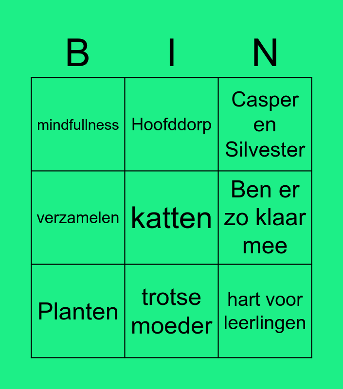This bingo card has 9 words: Planten, Casper en Silvester, Hoofddorp, verzamelen, mindfullness, Ben er zo klaar mee, katten, hart voor leerlingen and trotse moeder.