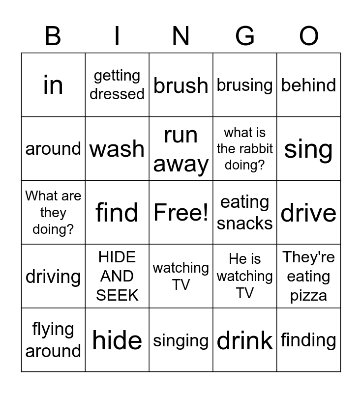 This bingo card has a free space and 24 words: HIDE AND SEEK, hide, run away, flying around, behind, in, around, getting dressed, eating snacks, watching TV, what is the rabbit doing?, What are they doing?, He is watching TV, They're eating pizza, wash, drink, drive, brush, sing, find, finding, driving, brusing and singing.